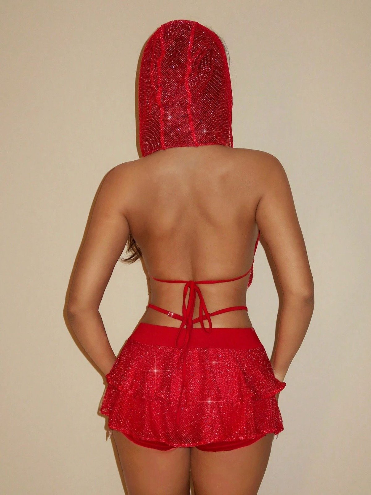 - La matière : Un tissu rouge scintillant . L'effet "glitter" est omniprésent, captant la lumière à chaque mouvement.