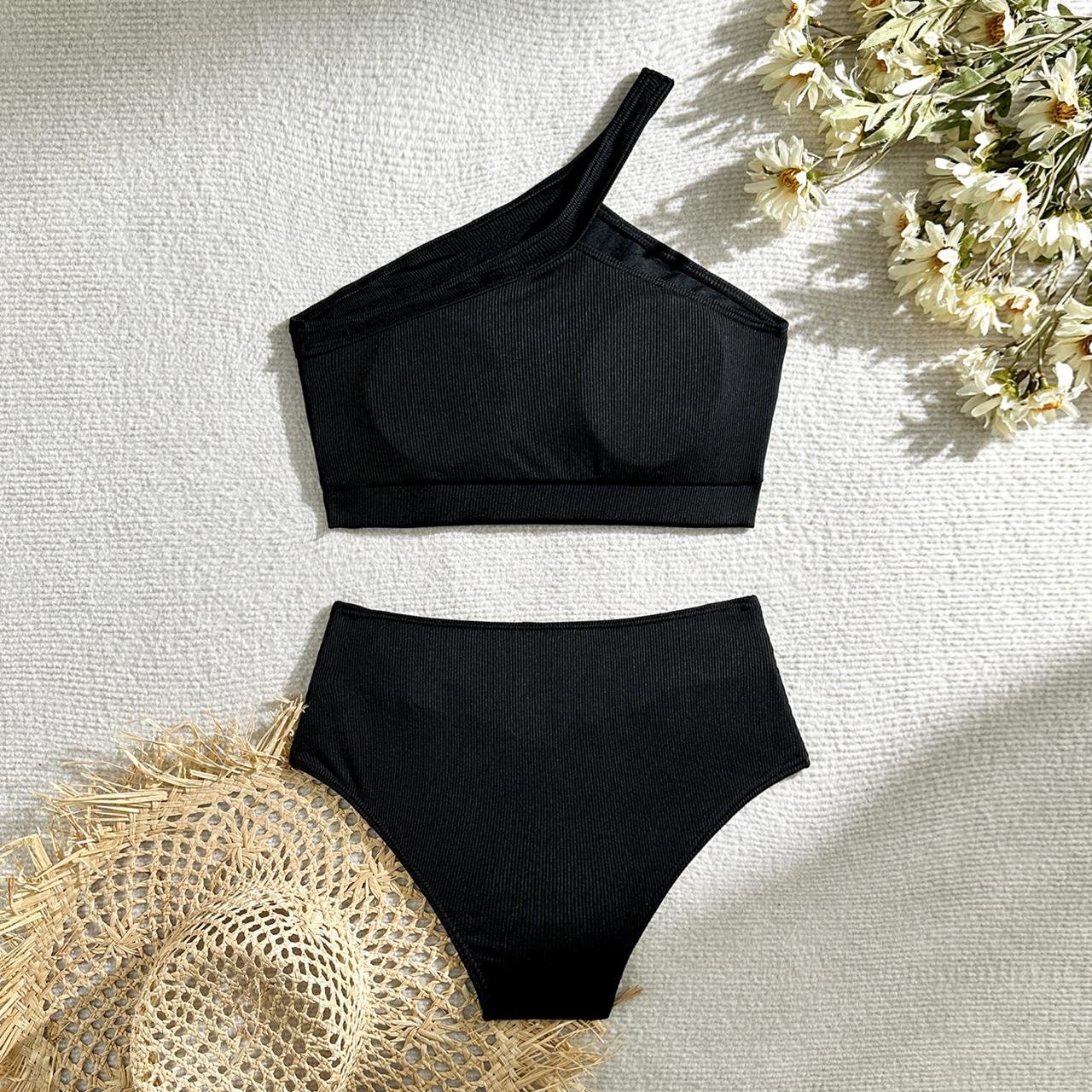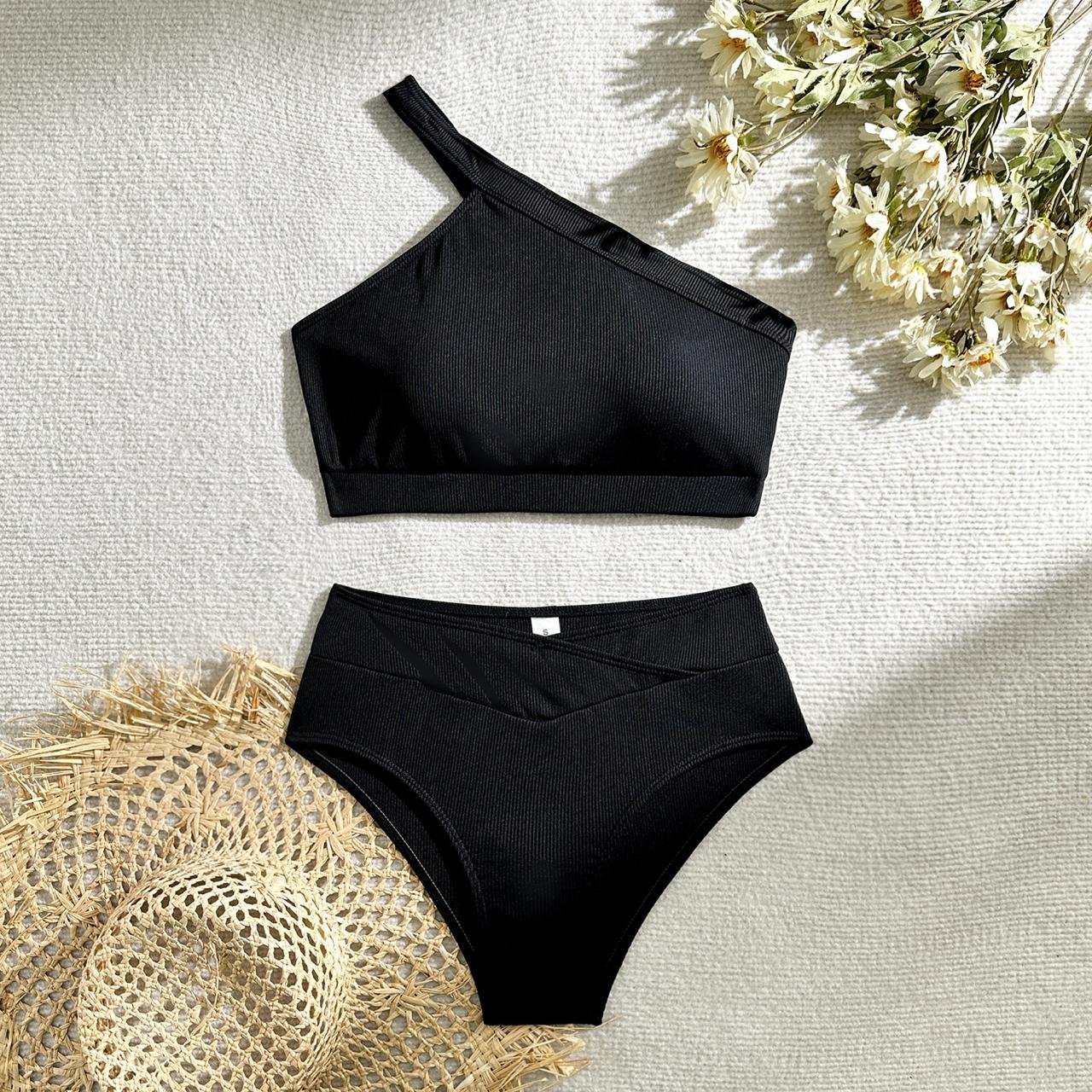 Le Haut : Un haut de bikini asymétrique (une seule épaule) en tissu côtelé noir. Cette coupe est idéale pour offrir du maintien tout en ajoutant un intérêt visuel architectural.